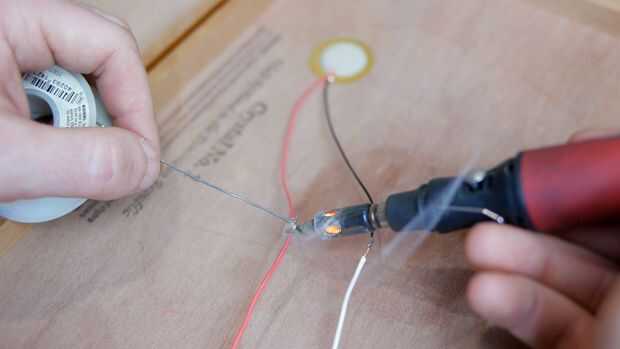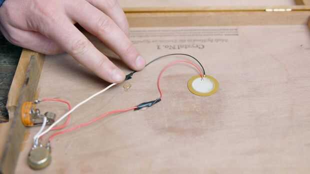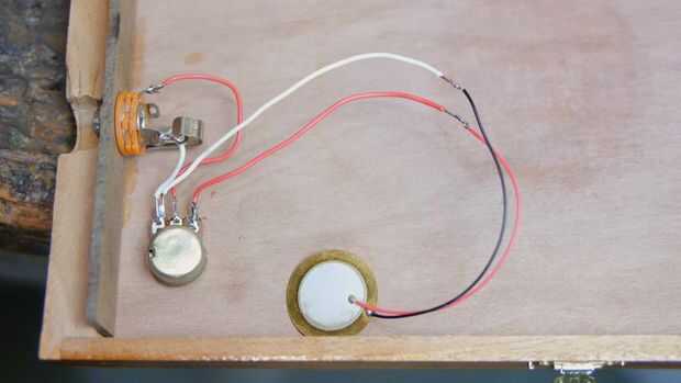 Las conexiones expuestas que están en riesgo de entrar en contacto con ellos deben ser cubiertas de cinta aislante. En este momento, pueden pegar los cables a la caja para evitar moverse, y el piezo pegado en la parte inferior de la tapa de la caja. La colocación de la piezo debe ser justo en el centro de la tapa donde la madera experimenta la mayoría de los movimientos y así más las vibraciones para el piezo para convertir en una señal de audio.