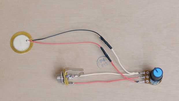 En la primera imagen por encima de usted puede ver el trazado del circuito que utilizaremos aquí. Es difícil de explicar cada paso en palabras pero debe ser muy claro al estudiar las imágenes. La toma de audio está conectada primero el potenciómetro (alambres con núcleo de fundente de la soldadura) y luego a los cables del transductor piezoeléctrico.