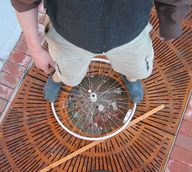 un giro pot o zine estante es fácil hacer de una vieja rueda de bicicleta. Son muy útiles para saturar de la cocina y mantenimiento de ollas y utensilios accesibles (giros!) o para exhibir revistas en un comedor / sala de estudio o pasar el tiempo es