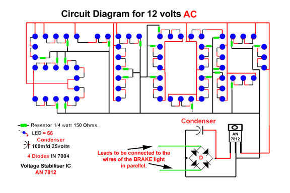 El circuito es el mismo pero un puente rectificador y un estabilizador de tensión se suman al circuito.