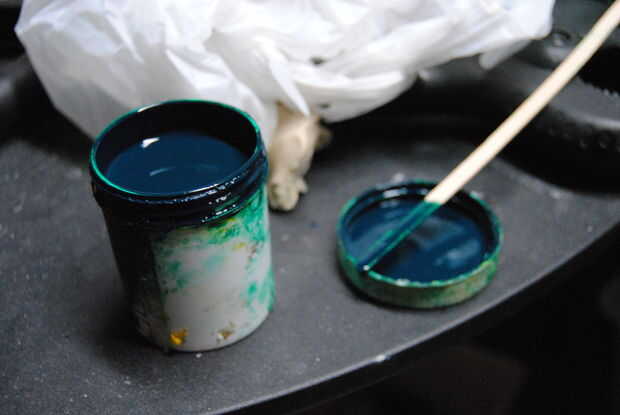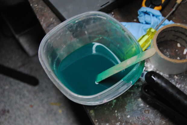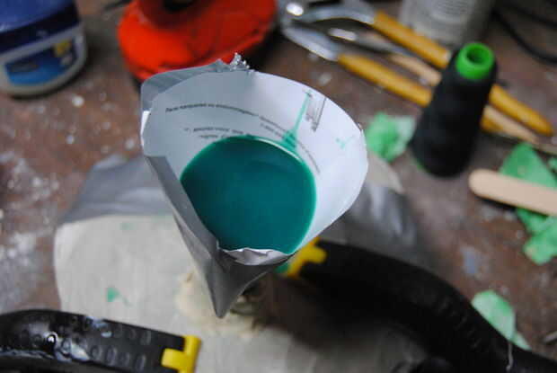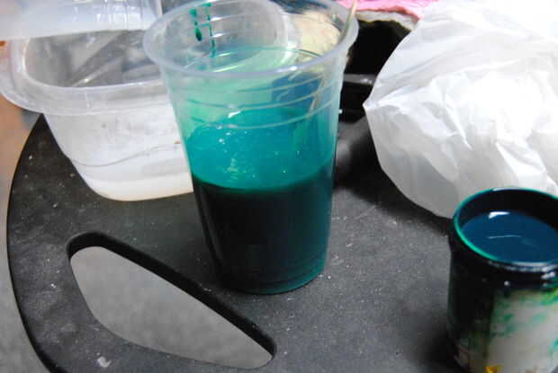 ahora mezclar la silicona con algún tinte de silicona verde, hay tintes específicos para siliconas Asegúrese de no usar nada. también siempre tiñe una parte de la silicona antes de mezclar los dos componentes juntos así que todavía puedo controlar mi color para ya. cuando tu feliz con el color verterla en el molde. en mi caso hice un embudo de papel y poner arcilla en la parte inferior para mantenerlo arriba de esa manera puedo dejar manos libres, siempre hacen un poquito más y luego será necesario sólo en caso de fugas o de las Naciones Unidas para problemas de vista, también ayuda a tener algo extra expuestos y así podrás mantener el control de cuando la silicona esté seca.