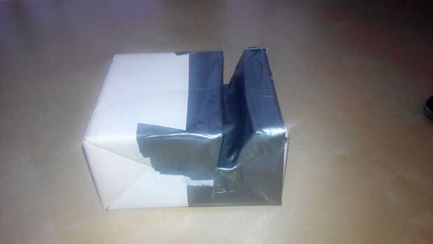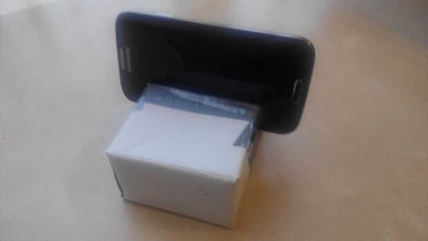 Yo no tenía un soporte útil, así que construí uno mismo de cartón y algunas cintas. El smartphone tiene que encajar perfectamente y ligeramente inclinada hacia la mesa.