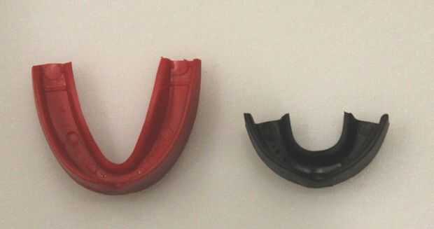 cortar la parte de "correa" de las boquillas y recortar las piezas para adaptarse a la boca. El rojo será la pieza de arriba y el negro será la base para este ejemplo. no es necesario para que la pieza inferior para ser tan grande como la pieza de arriba