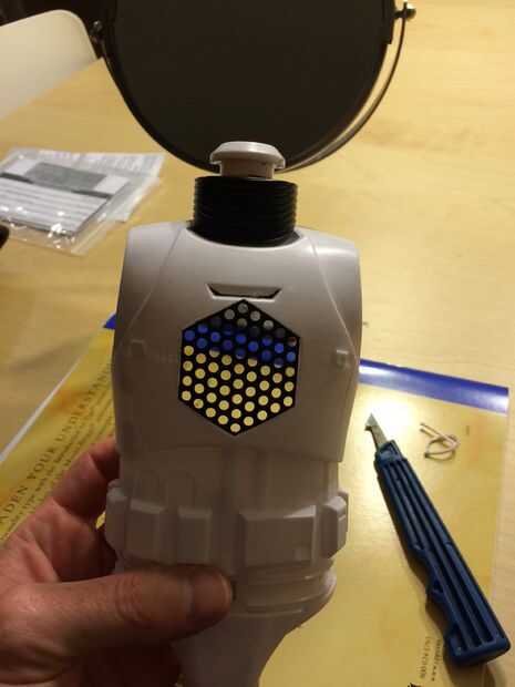 Para cortar la forma en el pecho de Storm Trooper, usé un cuchillo de plexiglás. Usted necesita tener cuidado aquí. Usé la placa como mi guía, sujeto con mi mano. Utilizar cortes ligeros para hacer lentamente su camino a través de la plástica. No trate de pasar demasiado rápido.