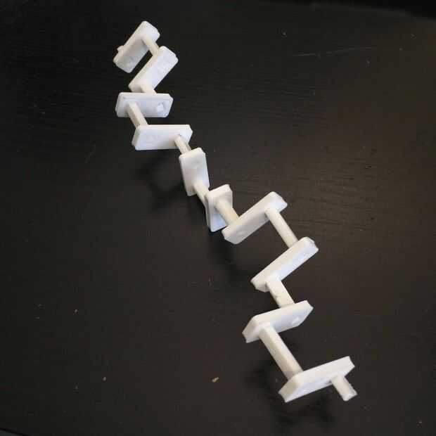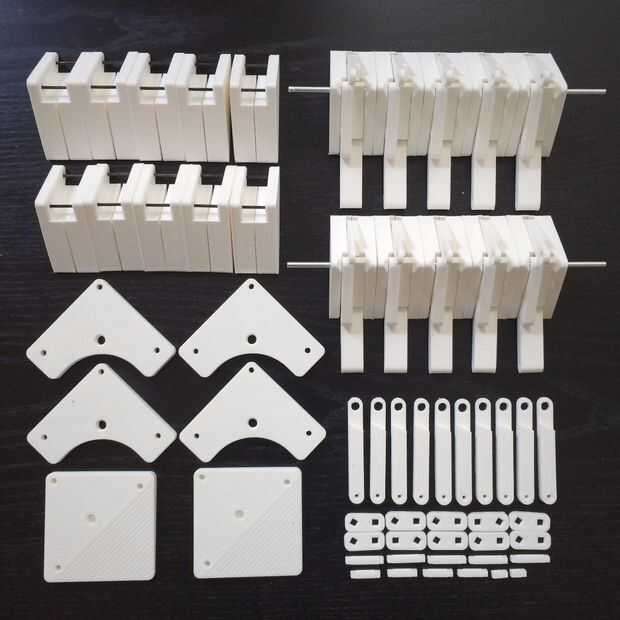 Una máquina de caminar consta de 107 piezas impresas y 63 piezas sin impresión, para un total de 170 piezas individuales que conforman la máquina. De las partes impresas, hay 13 formas únicas que, cuando está montado, moviéndose de forma 61 piezas. El esqueleto rígido que mantiene unida a la máquina se compone de 9 elementos, mientras que las otras 161 partes forman las piernas y el mecanismo de a pie, todo impulsado por el cigüeñal central que 21 de esas partes.
