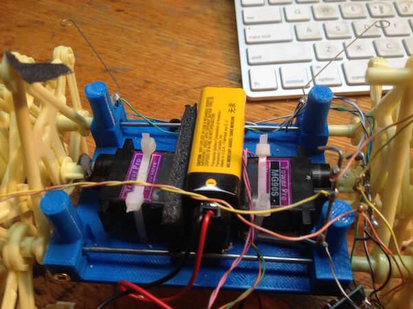 Había una perfecta cantidad de espacio entre los servos para poner una batería de 9 voltios, usé cinta adhesiva con respaldo doble para sostenerlo en lugar.