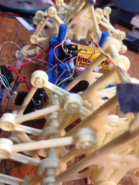 Básicamente, corrí las barras con conjuntos de las patas a través de y entonces vio donde el servo necesita sentarse. He usado una Dremel con una broca pequeña y hecho agujeros a través del cual corrí zip lazos para sujetar los servos en su lugar.
