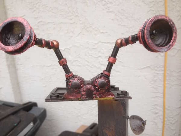 A continuación rociaron los frentes ojo con cromo aerosol, y cubierta con aceite frotó el bronce pintura de aerosol. Después de que la pintura estaba totalmente seca, seco cepillado en algunas pinturas acrílico metálicos para llevar a cabo los aspectos más destacados. Por último, lo acabé con una capa mate de spray sellador transparente.