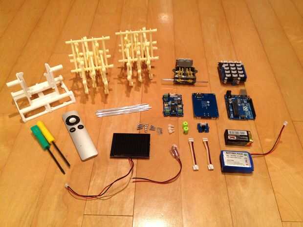 La Strandbot es una actualización DIY para la Strandbeest diseñado originalmente por Theo Jansen. Strandbeests son maravillosas criaturas mecánicas que son capaces de moverse sobre el propio uso de un poco de la energía eólica. Lamentablemente mi apartamento pequeño es poco viento, así que decidí actualizar una miniatura Strandbeest utilizando un Arduino y algunos motores. El cerebro es alimentado por una batería de Li-Po solar cargada así que vivirá el Strandbot como pueden encontrar algunos rayos del sol. Los motores son remotos controlados usando un Apple Remote, o con un poquito de codificación puede hacerlo funcionar con cualquier IR remoto transmite en 38 kHz.