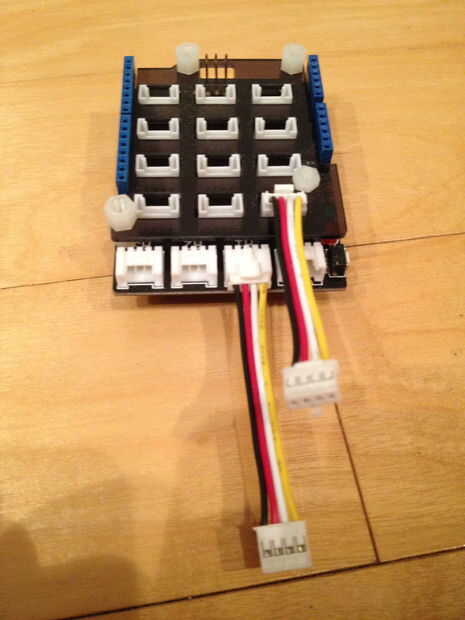 A continuación, conecte un cable de GROVE para el primer conector I2C de la pantalla base.