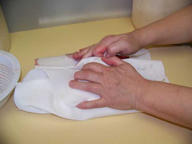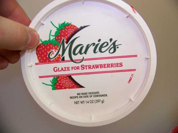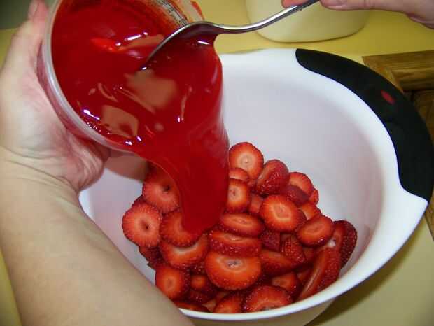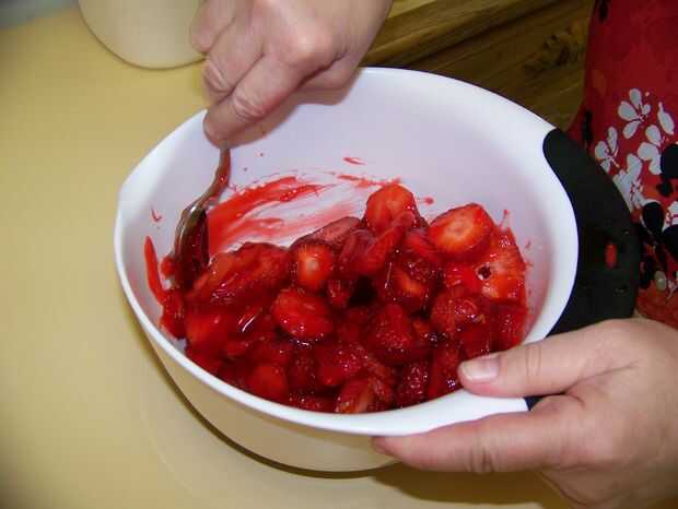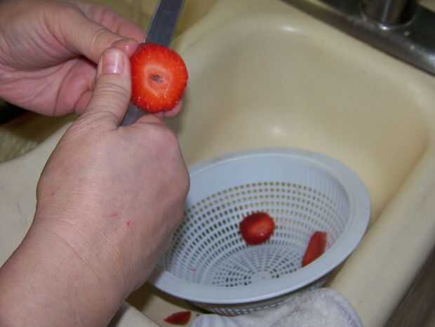 Mientras que el relleno de plátano es enfriamiento, podemos empezar a preparar el relleno de fresa. Este podría ser el paso más fácil, excepto tratar de resistirse a comer las fresas, que es bastante difícil. Comience por cortar encima de las fresas en el colador. La tarta original había acabo de poner la fresa entera con el tallo cortado, pero prefiero rodajas de fresa. Puede decidir cuál prefiere. Una vez que haya terminado con todo el corte que querrá lavar las fresas con agua para asegurarse de que están completamente limpios. Después de enjuagar las fresas necesitan secarse, así que primero Sacuda cualquier exceso de agua y luego vierta sobre una toalla de papel o una toalla de mano normal y les pat seco. Una vez secas, las fresas se pueden poner en el tazón y usted puede Agregar el glaseado de fresa, utilizamos casi un todo contenedor que contiene 14oz de esmalte. Las mejores cosas que hemos encontrado hasta ahora están glaseado de Marie de fresas, pero supongo que cualquier esmalte funcionaría. A continuación, simplemente mezclar las fresas con el esmalte.