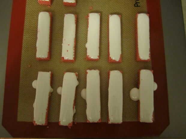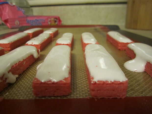 Difundir la pelusa de la melcocha sobre las obleas de fresa; un cuchillo de mantequilla trabajado bien para mí. Trato de poner como mucho por lo que pueda sin tener ir por todo el lugar, esto es más difícil de lo que suena como el pelusa tiene una mente propia forma en que quiere fluir.
