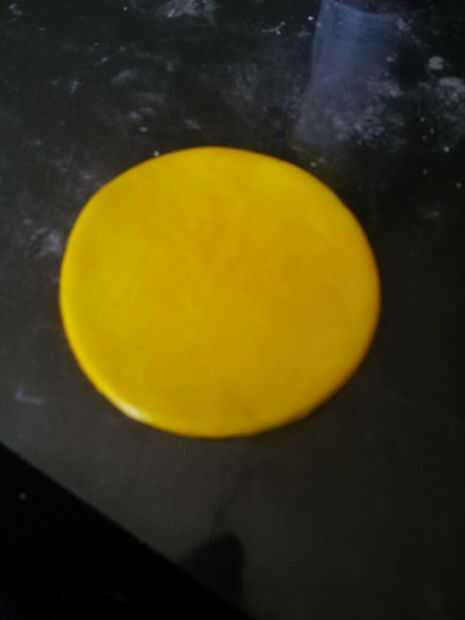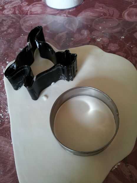 Estirar el pastillaje fino real. Presionar el cortador de gato en el pastillaje y menee para asegurarse de que salga una forma limpia. Correr el dedo por el borde de todo el asunto para suavizar los bordes aún más. Ahora repita este proceso usando un cortador de círculo o un taza/vaso. Deje que el pastillaje seco durante al menos 4 horas por lo que puede ser rígido.