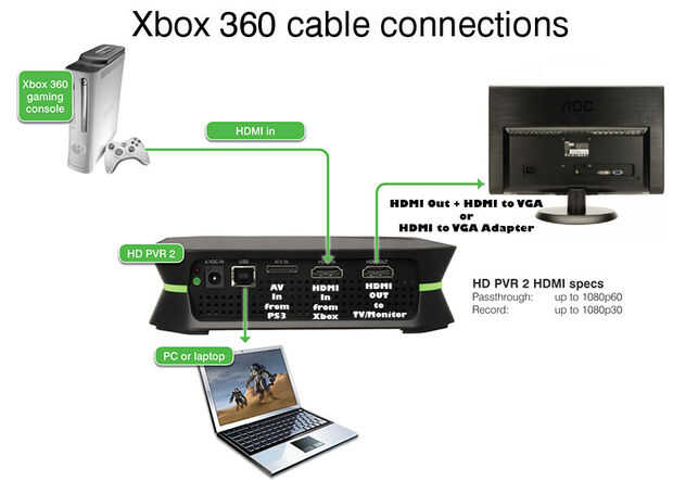 Después de haber tomado aparte la cubierta del cable de Xbox todo lo que necesitas hacer es conectar el Cable de la Xbox con el Cable HDMI en la parte posterior de su 360.Volume de Xbox de tomar el Cable de HDMI de Xbox 360 y enchúfelo en el puerto de entrada en el dispositivo de captura. Utilice un cable de HDMI secundaria enchufe en el puerto de salida en el dispositivo de captura y proceder a colocar bien el cable de HDMI a VGA o HDMI al adaptador de DVI. Todo lo que queda es enchufar el adaptador de monitor.