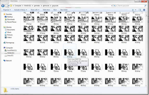 El video fue Ripeado a archivos de mapa de bits de escala de grises de 84 x 48 a 20 cuadros por segundo utilizando la siguiente línea de comando: