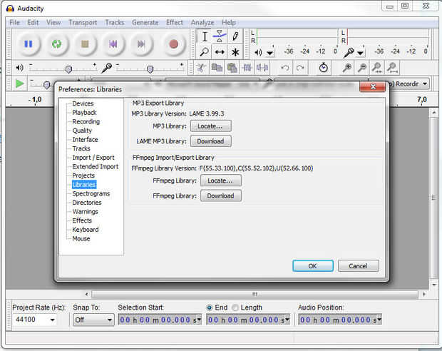 Audacity tiene bibliotecas el cojo y el ffmpeg para trabajar!! Vaya control de Preferencias -> bibliotecas que Audacity listas la LAME y la versión de ffmpeg. Si no hay números de versión se da, significa que Audacity no ha localizado las bibliotecas y los pasos no funcionará! Una vez más, no voy a dar asesoramiento técnico sobre el uso de Audacity. Parece áspero, pero créanme, ya hay cientos de tutoriales sobre Audacity. No voy a repetir aquí esa información.