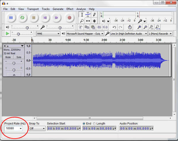 Ahora, establezca el tipo de proyecto en 10080 Hz (ver imagen). Esto es importante porque sincroniza el audio y vídeo. Como jugaremos vídeo a 20 fotogramas por segundo = 504 x 20 = 10080 bytes de datos de imagen por segundo, por lo tanto necesitamos también 10080 bytes de audio por segundo. ESTE ES EL TRUCO MÁS IMPORTANTE EN TODO ESTO!