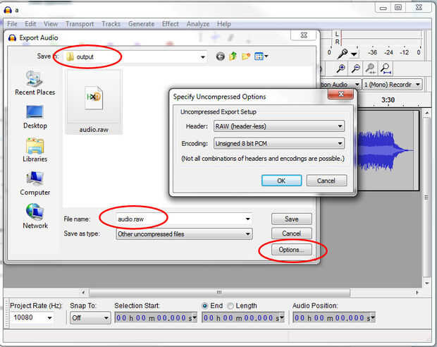 A continuación, exportar audio como primas codificaban sin signo de 8 bits (ver imagen)