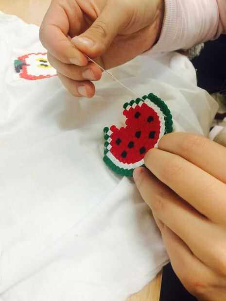-Steek je naald puerta de strijkparels en de camiseta heen. Herhaal dit meerdere keren tot je figuurtje vasthangt aan je t-shirt.