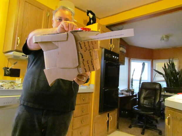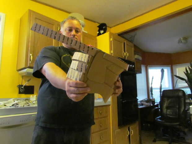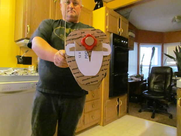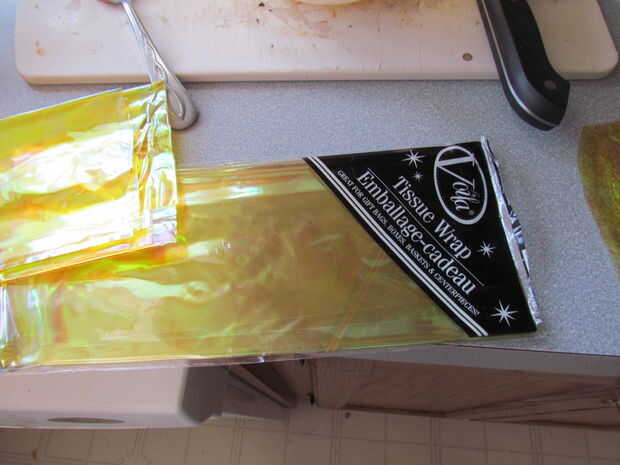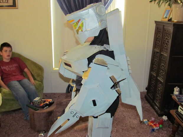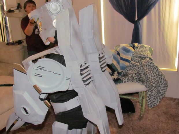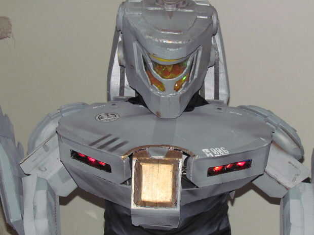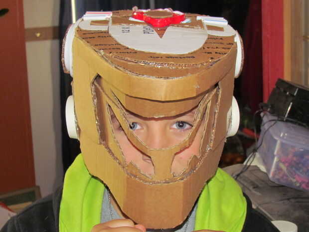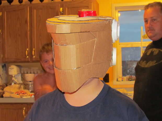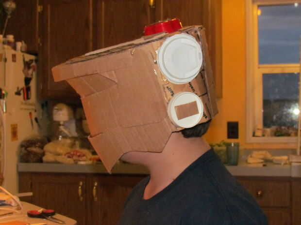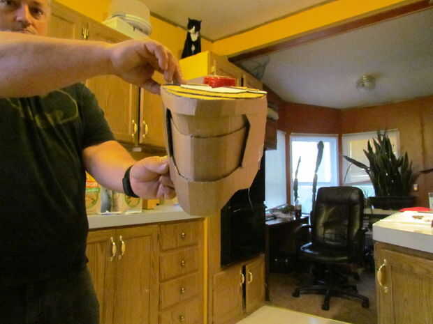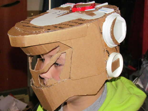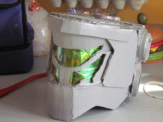 Para hacer un Jeager Head comencé con una placa en una forma oblonga, el delantero tiene una cabeza plana de todas formas, luego añadido placas cartón más delgadas para el frente. Delantero tiene algo así como una zona cóncava de la cara así que tuve que hacer dos piezas corte tan el hecho un interior común en el medio que se indenta de la articulación externa.  Pegamento caliente una vez más todo lo mantiene unido.  Una vez que tenía la parte superior y el frente, hice unas tiras de cartón y, con mi hijo sosteniendo sobre su cabeza, mide y une las piezas de la espalda.  Si ejecuta que la cartulina las tiras sobre un filo como el borde de un contador le dará una bonita forma redondeada lisa. los acentos redondeos que ves son los fondos de las tazas de papel que ha cortado, los círculos más grandes son las tapas de bebida caliente.  Corté también hasta algunas pajas de beber para piezas de acento encima de la cabeza. He encontrado algunos celofán oro en la tienda de dólar que pensé que funcionaría para visera de oro distintivo de huelguistas. Primer dinero gastado! $1,00!  Cortar un trozo de chatarra de plástico de algunos embalajes y había pegado una hoja doblada de celofán a la hoja clara, luego había pegado el lío todo en.  Salido de mi amado utilizar otro pegamento mi amado, Goop y caliente pegamento.