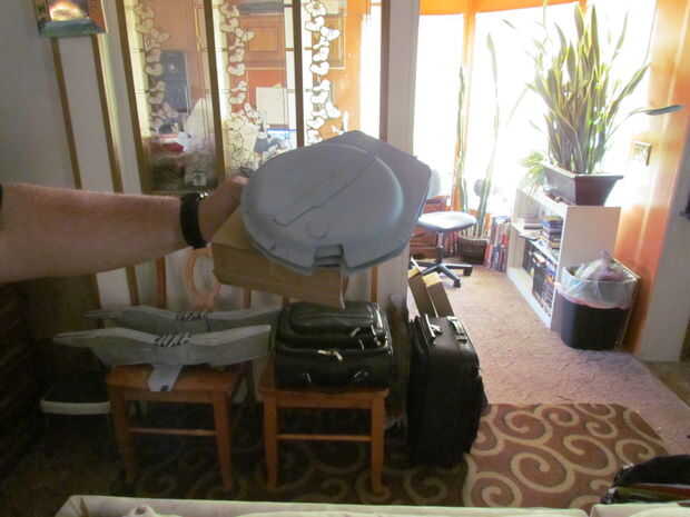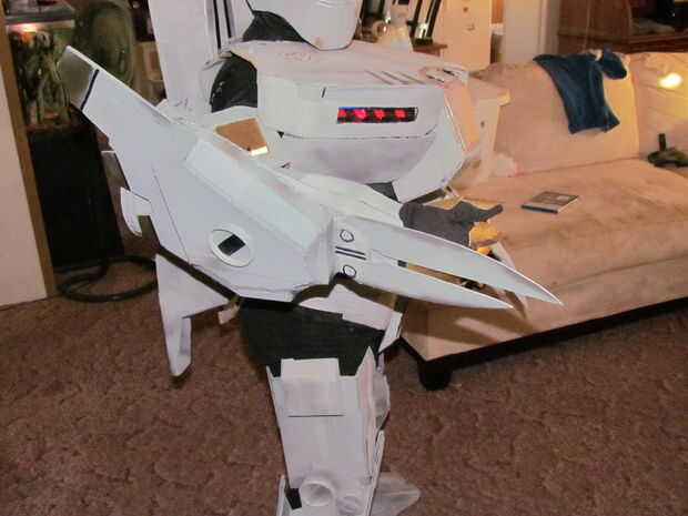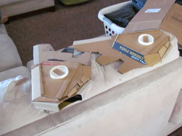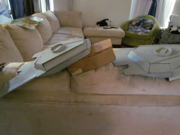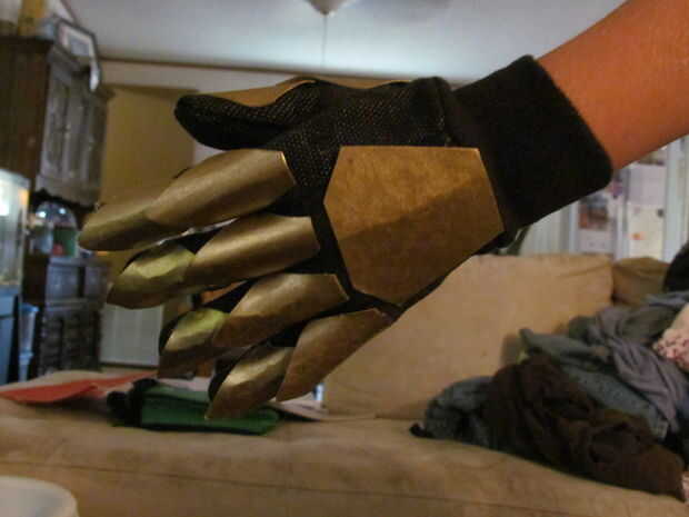 Armas de cerrojo son algunas de las partes más frescas de lo, amo a los protectores de codo con aletas y los platillos redondos sobre sus hombros, no hay que olvidar las doble cuchillas en el extremo de sus brazos.  Los protectores de codo, dibujé a mano alzada, pues con una regla.  Tuve que recortar un poco porque se olvidó que no estaba haciendo esto para mí... pero para mi mini-me. para agregar la dimensión extra que les basta con cortar de una forma más pequeña para el exterior, a continuación, hacer tiras para llenar en el espacio, montado en un ángulo, por supuesto.  Los discos de hombro son las placas de papel pegadas a cartón oblongas, con un disco separador pegado entre ellos que usted puede notar en algunas de las fotos, los discos se pegan directamente a las cajas de la parte superior del brazo y en fotos más adelante se levantan lejos en un ángulo 30 grados. Me gustó mejor.  Tuve que comprar unos guantes de Jersey, $1.00 que es cartulina de la caja del cereal solo cortar en diamantes y pegadas a los guantes.
