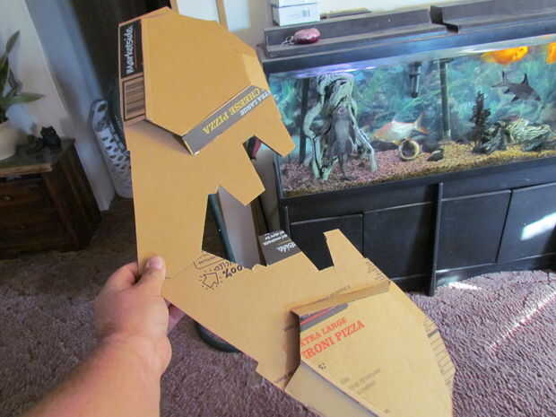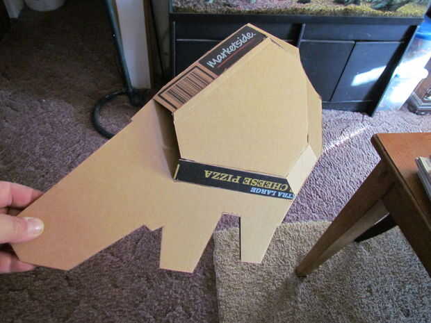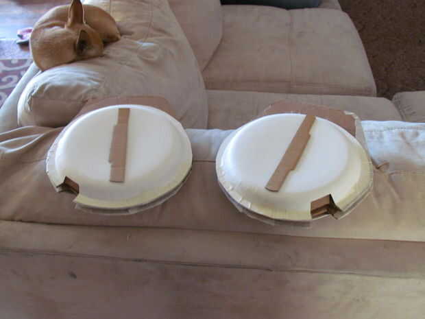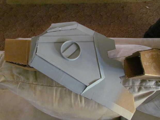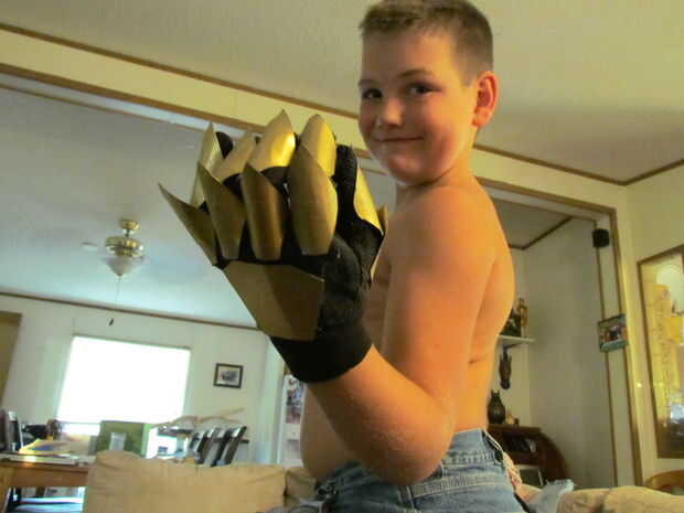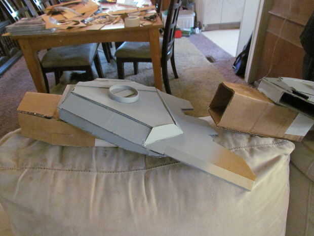 ¿Pintura, $15,00 Total hasta ahora? $23,00 todavía no está mal!  Se cortan las láminas del brazo fuera de una vieja tapa de bolsa Rubbermade. luego se intercala entre dos pedazos de cartón.  Detalles en plata que parezcan afilados.