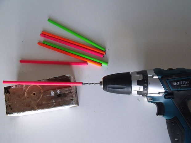 Taladre orificios de 3 milímetros, 20-25 mm de profundidad. Sonido más difícil de lo que es. El palillo del grafito o de color guía el taladro recto. Hice agujeros de 80 y no uno torcido.
