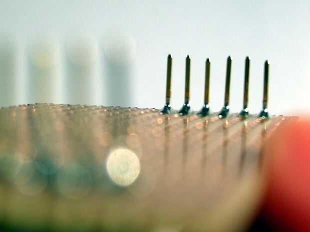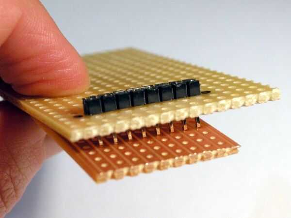 6 pines es razonablemente fácil, pero usted puede encontrar 8 pines más complicado si el proceso de ajuste ha dejado un poco flojos los pernos (tenía algunos que eran propensos a caerse!). Para evitar que los pernos alineados, usé un segundo trozo de placa perforada como una plantilla de separador. (Si haces esto, coloque los pernos en la fila superior de los orificios, no unas filas hacia abajo como en mi foto. Esto hará que sea más fácil de acceder con el soldador...)