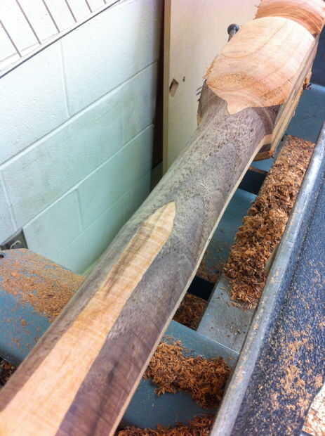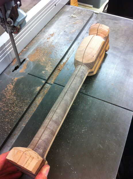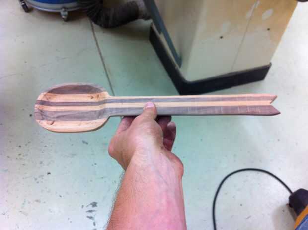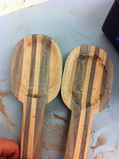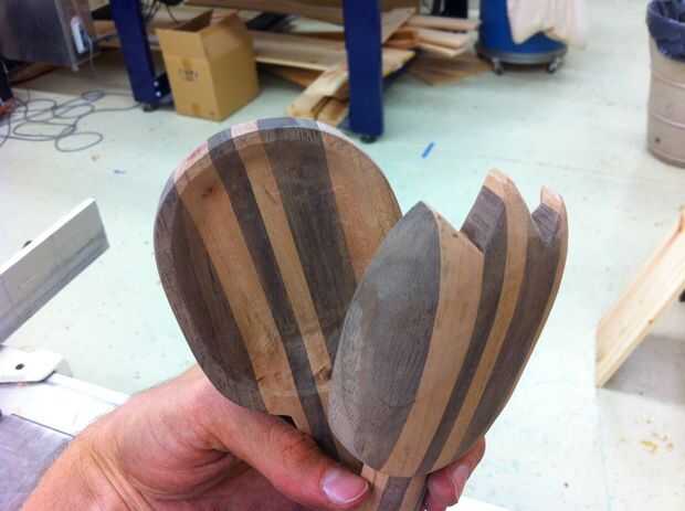 Después de varias horas, tenía la forma que quería. El mango era un poco más de una pulgada de espesor y el tazón de fuente era aproximadamente tan ancha como hacerlo (derecha alrededor de 3 pulgadas). Corté la pieza longitudinalmente por el centro de la Sierra de banda que me dio dos formas de servidor simétrico ensalada. He recortado el desecho de los extremos y entonces comenzó a formar en la lijadora de banda.