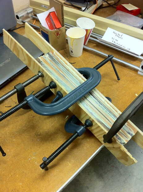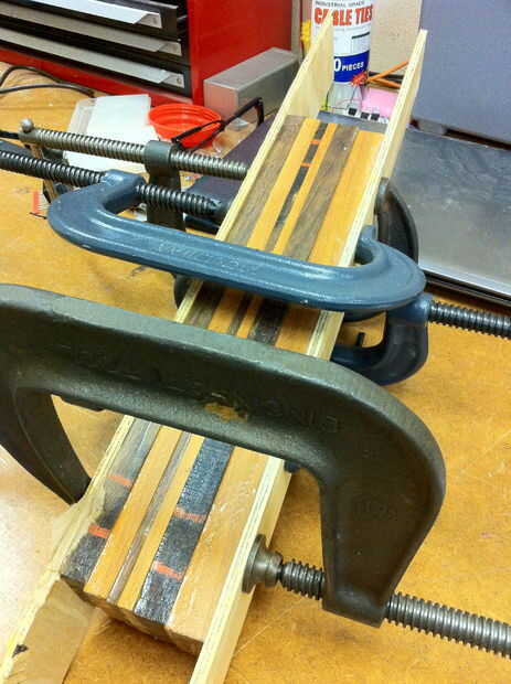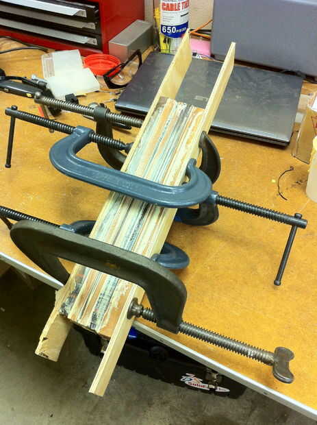 de todos modos, después corrí a cada lado de cada listón a través de la Unión, usé un tac-paño para eliminar el serrín y comenzó el pegamento-para arriba. Me aplica pegamento de madera a ambos lados de cada listón y frotó con mi dedo. Usé un poco de pegamento, y así fue muy difícil obtener todos los listones alineados entre sí. Pegamento de elmer crea una capa casi sin fricción entre cada listón, así que cuando sujeta la pieza, como aprieta las abrazaderas, los listones comenzaron a moverse y deslizarse fuera de la alineación. Estaba muy nervioso que no iba a ser capaz de conseguir todo alineado otra vez, pero después agregué más pinzas en diferentes ángulos y posiciones tiene cada cosa enderezado... ufff! nervio-racking