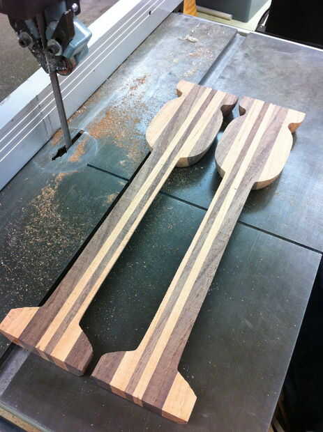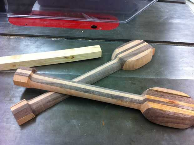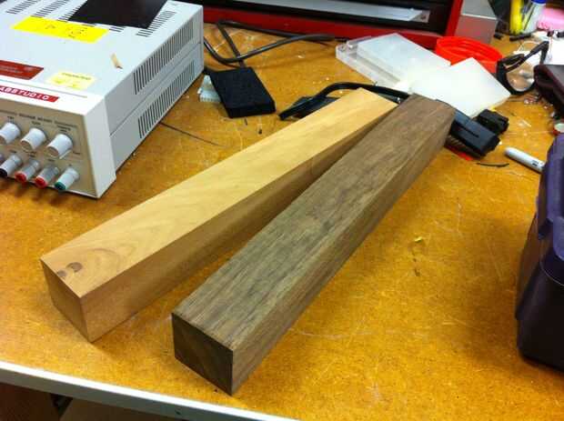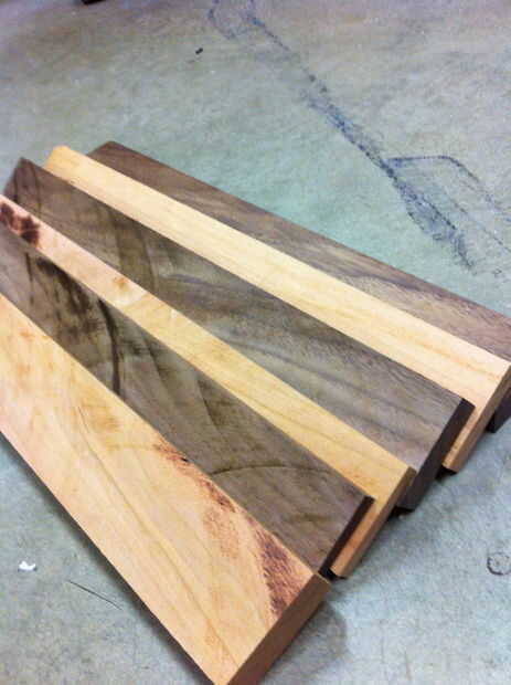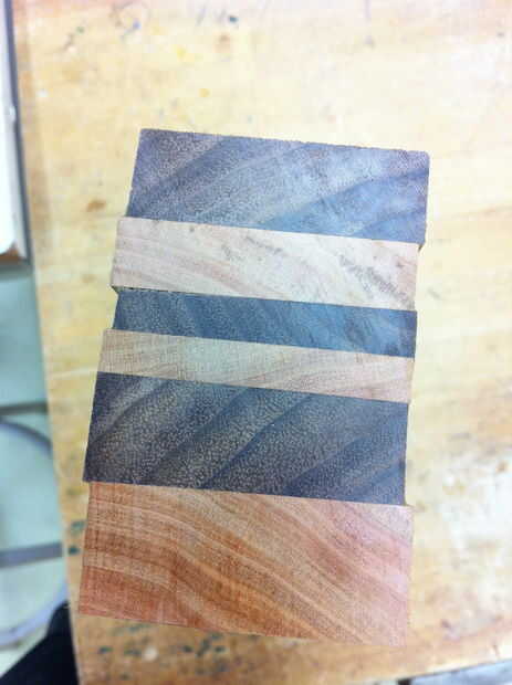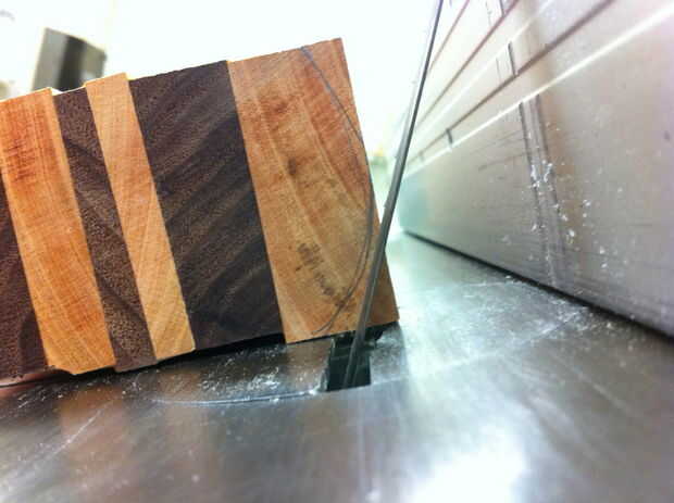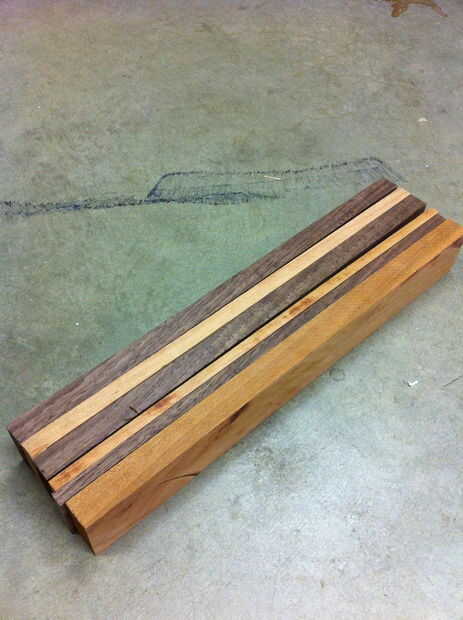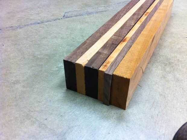 RIP algunos listones delgados de su madera favorita en una sierra de mesa. Usé la nuez y cereza porque ambos tienen grano muy agradable y son muy diferentes colores (las rayas serán muy obvias). Los espesores de estas tablillas es totalmente su decisión estética, sólo sé que cuanto más tienes, más complicados y más laborioso el proceso laminación (pegado). Utiliza 3 listones de cada tipo de madera y variados espesores para un look natural. Esto me dio totales, dando un espesor total de aproximadamente 3 pulgadas de 6 listones.