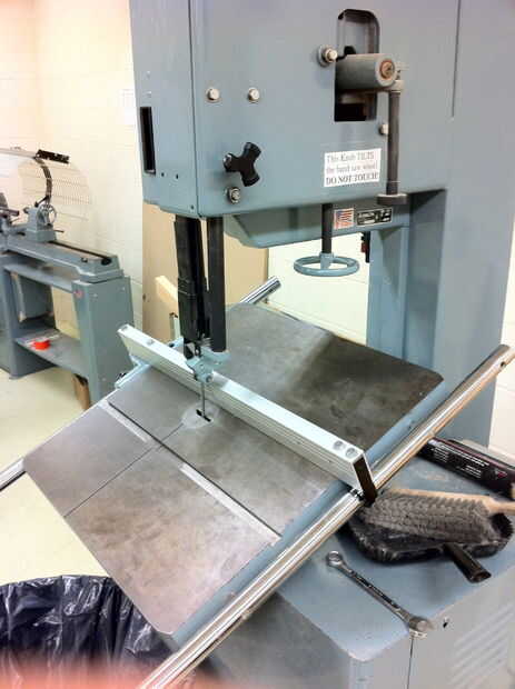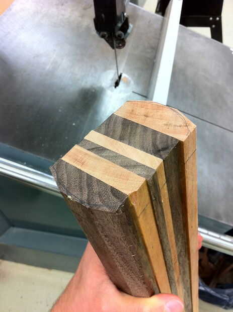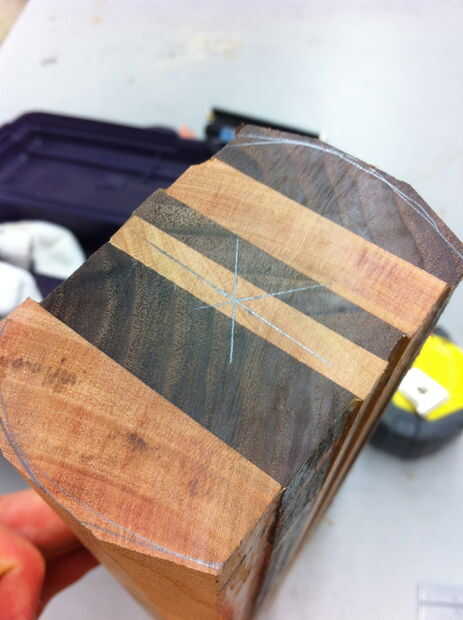 Recortar los extremos ásperos del laminado con una sierra de cortar y luego marcado círculos ásperos en los extremos de la nueva corte por lo que podría recortar algunos de los bordes de la Sierra de banda para facilitar el torno. (estos cortes no fueron los cortes normal 45 grados que haces normalmente para piezas de torno porque mis acciones no era cuadrado, era rectangular)