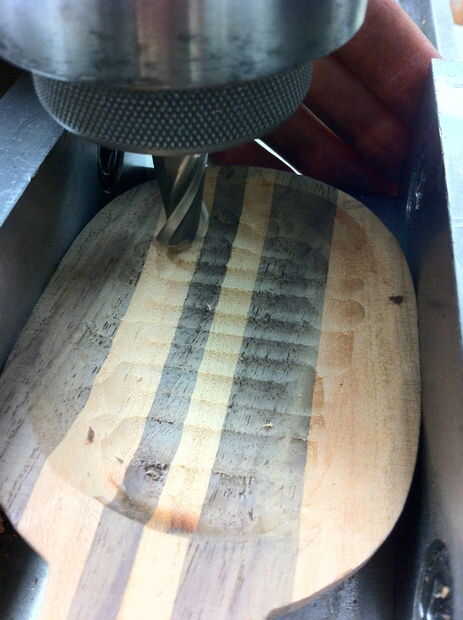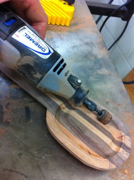 Después de que yo estaba contento con la forma general de los servidores, tengo mi dremel y lija poco tambor y comenzó esculpiendo los tazones de fuente. Esto tomó mucho más tiempo que las otras cucharas, porque cada plato era como el doble de grande y tuvo que ser más profundo. Pronto, después de quemar varios pedacitos de dremel, dio para arriba y pasa a un molino y un poco de fresa de bola. La molienda llevó tal vez 10 minutos por tazón de fuente, mucho más rápido!
