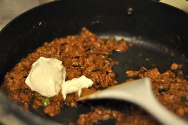1. Añada la crema agria y vino y cocine durante cinco minutos. Sazonar con sal y pimienta. Verter sobre el preparado arroz o fideos.