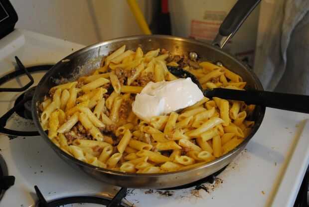 La crema agria es realmente lo que hace un plato de stroganoff y no hamburguesa como ayudante. También se hace la salsa más cremosa con un sabor sutil que complementa muy bien la pasta.