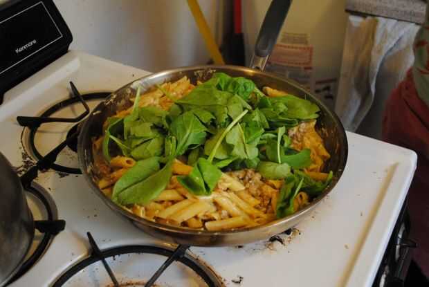 Añadir el veggie de elección. Como alguien que creció viendo "Grandes Chefs del mundo" me encanta incorporar color a todo lo que creamos. Espinacas no sólo añade interés y gran color al producto final, sino que es una gran fuente de hierro.