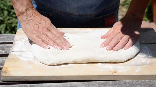 Añadir la levadura seca, pizca de sal, chorrito de aceite de oliva y suficiente agua tibia para hacer una masa, a la harina en un tazón grande. Si la masa es un poco demasiado pegajosa, añadir más harina. Empezar a mezclar con una cuchara de madera, pero una vez que las formas de mezcla, llegar allí con las manos. una vez que la masa esté manejable amasar sobre una superficie ligeramente enharinada, madera es mejor, por cinco minutos o así hasta que se convierte en elástico y recupera la forma. Presione su dedo pulgar y si la masa lentamente rebotes se realizan. Poner la masa en el recipiente se deja en un lugar cálido con cubierta con un paño hasta que se ha duplicado en tamaño.