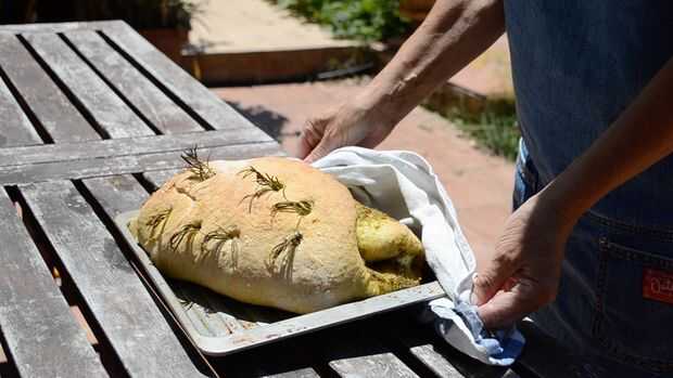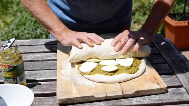 Retire la masa del recipiente y amasar ligeramente, utilice sus manos o un rodillo para facilitar la masa en forma rectangular de aproximadamente 1cm de espesor y doble como es amplia. Extienda todo el contenido de un pequeño tarro de pesto sobre la masa a 2cm del borde. Cortar la mozzarella en rodajas de 5 mm y arrage éstos sobre el pesto. Con cuidado enrollar la masa, un ligero toque se requiere, de un extremo a otro. Coloque el pan sobre una bandeja de horno engrasada. No te preocupes demasiado metiendo en el pesto y mozzarella, los bits que lava flujo como de los extremos son los mejores bits! Frote una capa delgada de aceite sobre la superficie, espolvorear con un poco de sal de mar y utilizar el pulgar para hacer agujeros en la superficie a pegar pequeñas ramitas de Romero en. Haga la bandeja en un horno calentado a 200C durante media hora o así y dejar que comience la erupción. Hornos con puertas de cristal se ofrece gran entretenimiento!