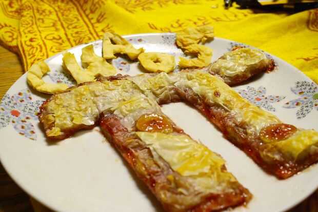 5. Extienda la pasta filo en papel encerado sobre una superficie limpia. Con una fuerte vinculación cuchillo, corte un gran símbolo de Pi de cada capa (subsistencia ellos capas encima de la otra para mayor facilidad y que empareja).