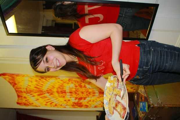 8. Coloque una mitad de la masa de Pi en una placa para horno ligeramente engrasada, junto con las letras C H A O S por encima de él. En la masa de Pi, cubrir con rondas de plátano y la mermelada de fresa en la parte superior de la capa. Coloque la segunda mitad de la masa de la Pi en la parte superior. Coloque dos rondas adicionales de plátano redondos en la parte superior y difundir un pequeño poco de mermelada en la parte superior.