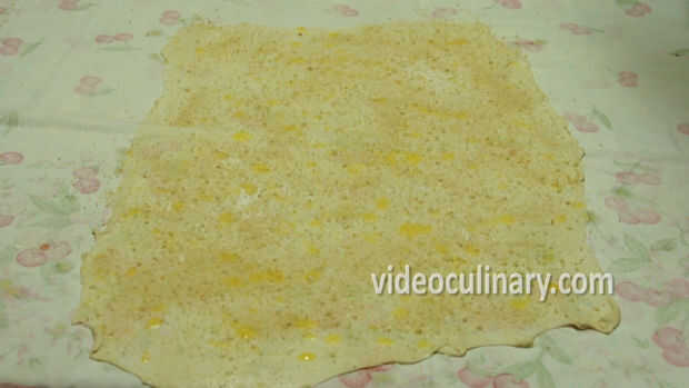 Unte la masa con mantequilla derretida; Espolvorear con azúcar en polvo y con unos 50 gramos de pan rallado.