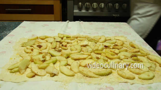Extender la mitad de la manzana relleno uniformemente sobre la masa. Enrollar la masa, usar la ropa para ayudarle a rodar. Transferir el strudel en una bandeja forrada con papel pergamino, brocha con mantequilla derretida y el polvo con azúcar en polvo.