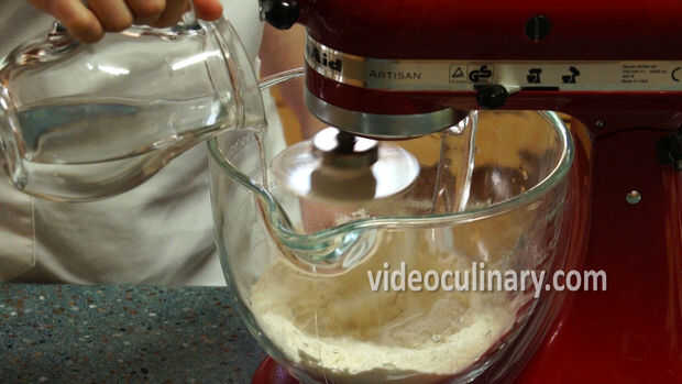 Añadir poco a poco 200 ml (7 onzas) de agua. Mezcla durante unos minutos hasta que estén mezclados, añadir 25 gramos (1 onza) de aceite vegetal y mezclar por 10-12 minutos, hasta que suave y muy elástica.