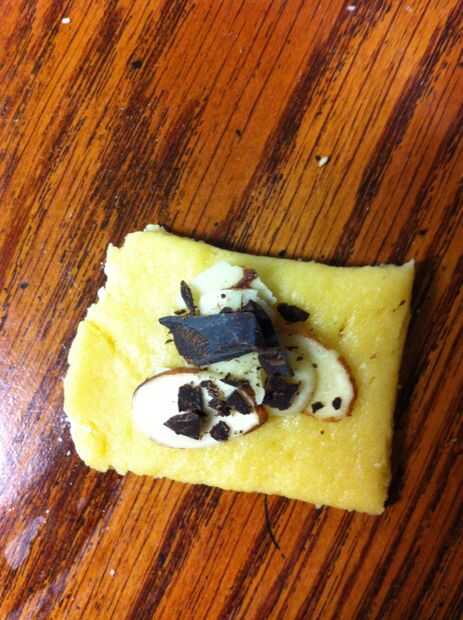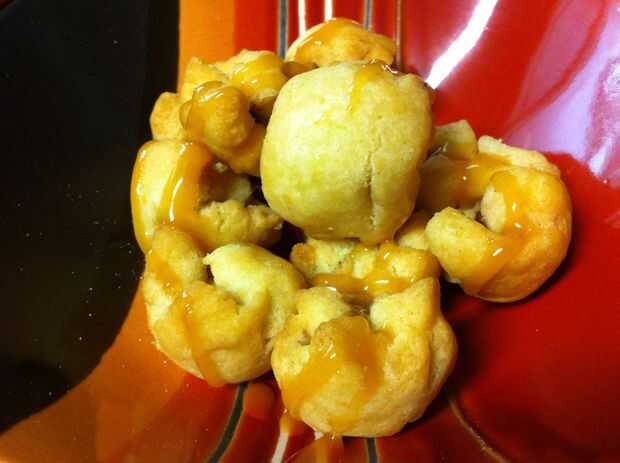 Corte el nueces y el chocolate en pedazos minúsculos. En la Plaza y luego se pliegan los bordes y rodillo en bola. Asegúrese de obtener los bordes rompieron juntos o se abrirá durante la fritura. Freír los struffoli y dejar secar. Poner struffoli en capa y salsa de caramelo.