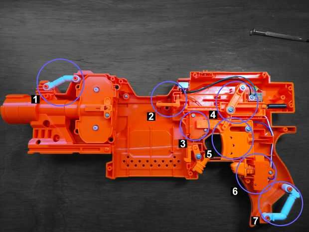 • Esto evita que el motor encienda si no hay ningún clip en el blaster y tiene un componente que impide que el gatillo es tirado.