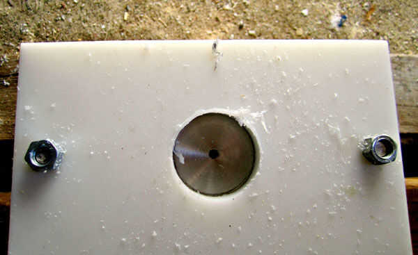 4. Soporte de la madera y el orificio de la base para guiarlo, como perforar el agujero de 1 1/2".  Asegúrese de que la Sierra es para cortar metal o la basura en el acero inoxidable.  Utilizar abundante aceite para enfriar las cosas.