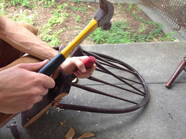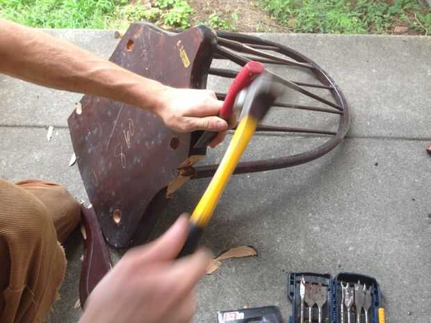 Respaldos de silla a veces pueden ser simplemente Desenroscar de la base. Otras veces que se debe eliminar más por la fuerza. Un cincel y un martillo trabajan bien para el asiento partido y suelte los husos. Tenga cuidado de no romper ningún husos o usted tendrá que reemplazar con otra cosa (que a veces es divertido).