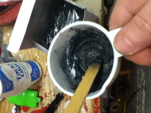 con un palito remover pequeñas (yo usé un palito ya que solo había comido una paleta), agregue el pegamento uniformemente en el polvo. Añadir un poco más de pegamento cada vez que el polvo se niega a seguir siendo absorbido. Sabes que tu pegote está listo una vez que no necesitará añadir más pegamento, y se absorbe el polvo.