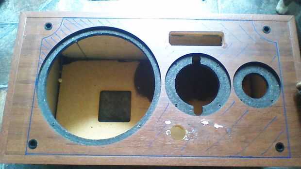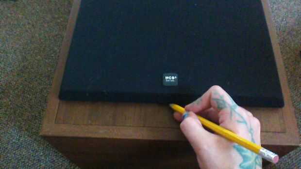 Una vez destripada, coloqué mi cubierta del altavoz en, exactamente donde pone en la cara de los altavoces de la marca. Quiero mi altavoz parece tan real como sea posible cuando está cerrada por lo que es muy importante que no cortar mi apertura algo mejor que mi cubierta del altavoz. Retire la cubierta del altavoz otra vez y utilicé un marcador claramente contorno donde quiero cortar mi nueva cara del altavoz.