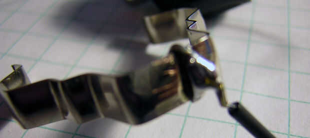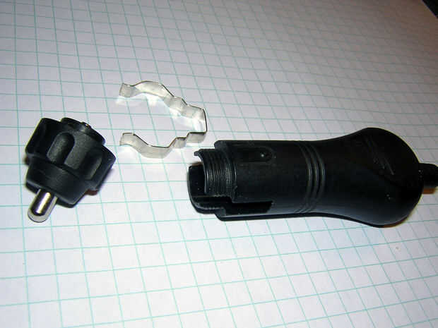 Tenga en cuenta que la tapa del enchufe auto (es decir un enchufe de encendedor) empuja hacia adentro y en el lado opuesto levanta una barra de metal. Esto es lo que envolverá el cable rojo pelado alrededor de 3/4". Simplemente empuje el retén y Envuelva bien luego oprima. Debe sostenerse en lugar bastante bien. Compruebe hacia fuera la imagen de abajo.